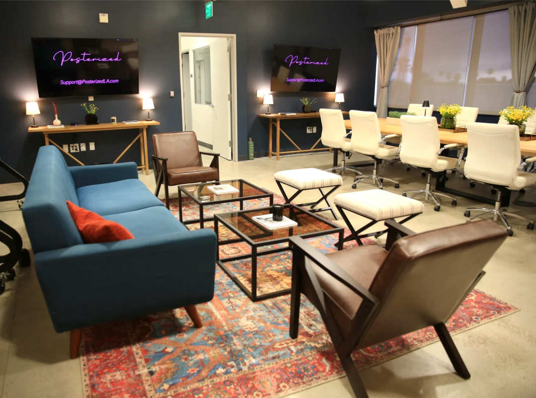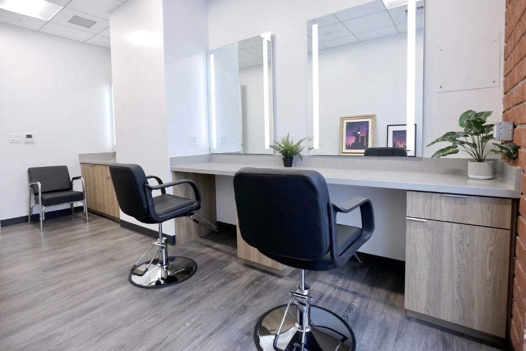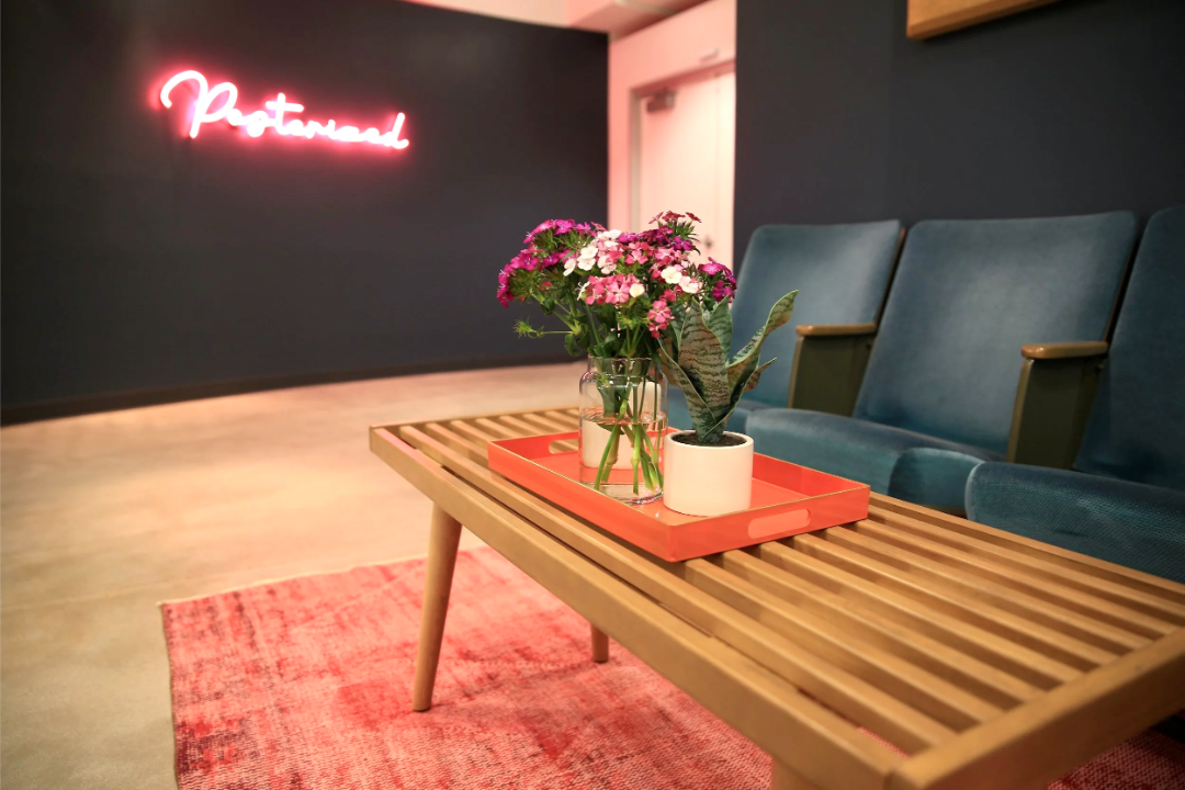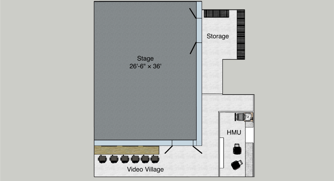 957 sq/ft stage is fully soundproof and measures 26’6” x 36’ with a 3×3 overhead grid. Perfectly customizable for set builds, green screen, and more. Located on the ground floor for easy load in, it features a row of external stage monitors for producer, technical, and director viewing, immediate proximity to talent hair and makeup room, as well as internal wiring that supports a feed to the third-floor conference lounges for comfy client viewing.
